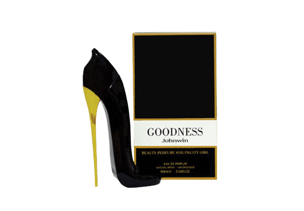 ادکلن زنانه جانوین مدل گودنِس از آن دسته عطرهایی است که روی طراحی بطری تأکید بسیار زیادی دارد. بطری به شکل یک کفش مجلسی زنانه طراحی شده است. این کفش شیشهای بهراحتی در دست بانوان جا میشود. برای اسپریکردن این عطر کافی است قسمت بالایی بطری را فشار دهید. در این لحظه بوی بادام و قهوه در فضای اطراف پخش میشود.