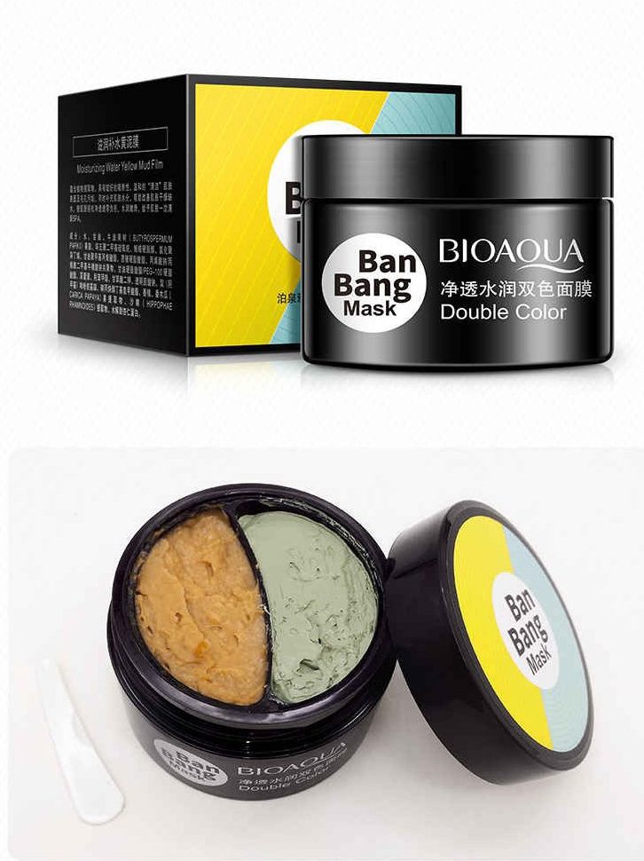 ماسک Ban Bang بیواکوا شامل دو قسمت ميباشد قسمت سبز سبزيجات خنك كننده و آنتى اكسيدان شامل چاى سبز نعنا گل كلم و برگ مليسا است كه مخصوص قسمت تيزون صورت مى باشد و قسمت زرد رنگ آن حاوى مواد مغذى مانند روغن بادام آووكادو پاپايا و نوعى گياهان وحشى ميباشد و مخصوص بقيه صورت است و اين ماسك به صورت تركيبى استفاده ميشود.